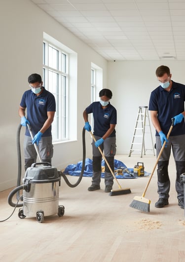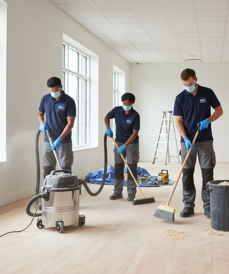 Remise en état des locaux après des travaux, éliminant poussière et débris.